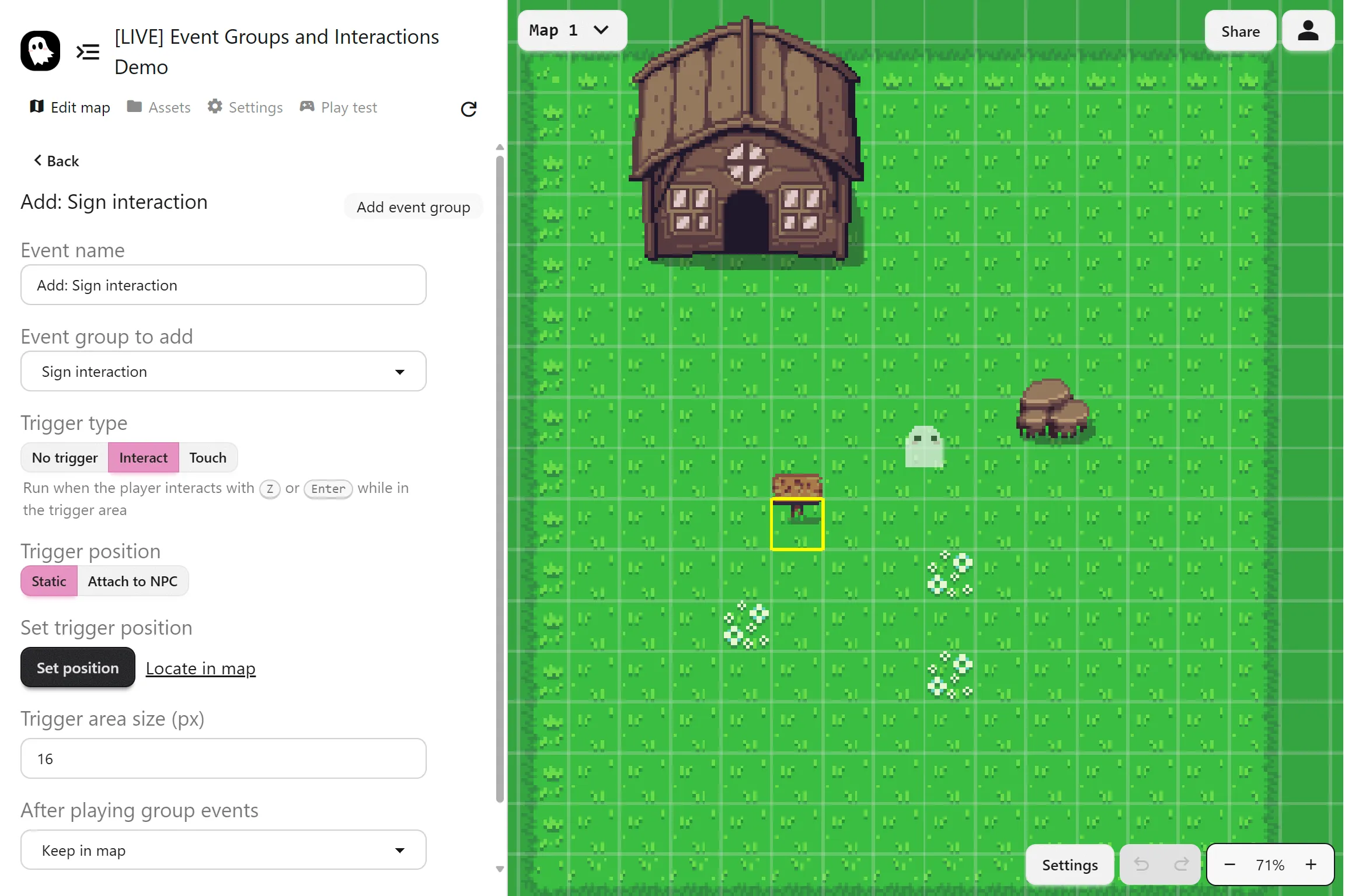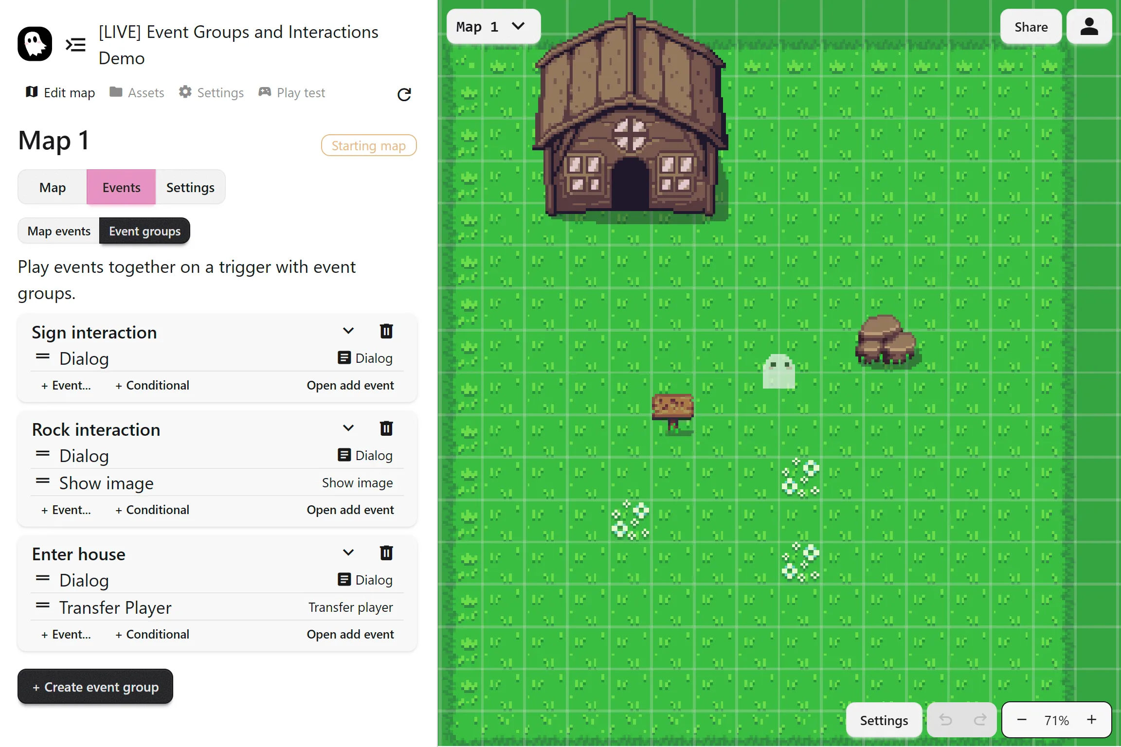 An event group is a collection of events that run one after another. They are put into the map and activated by the player interacting on it or touching it. They create interactive moments such as opening a door, talking to an NPC, picking up an item, or starting an NPC chase.