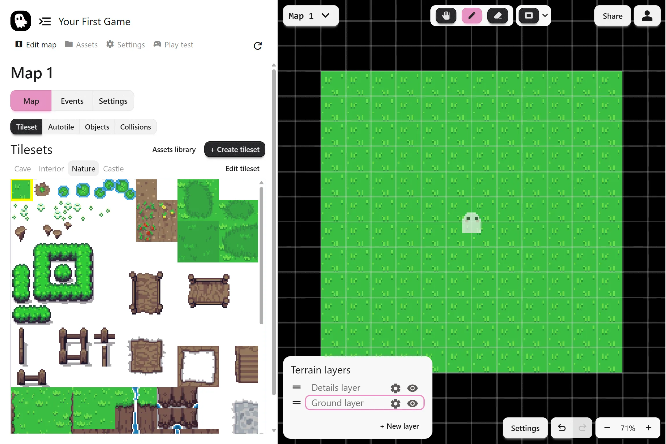 Section titled “Building a Map”A game needs a world. We’ll create a small starting map using the built-in assets.