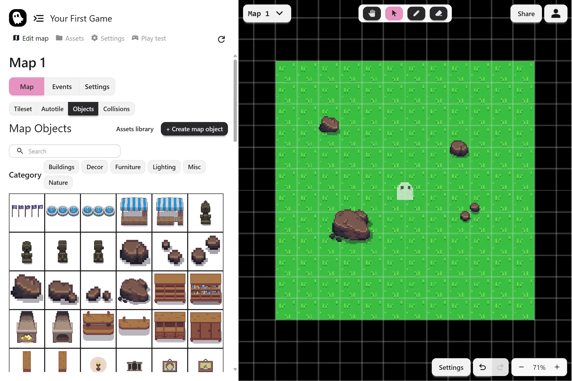 Similar to the tileset tools, you can find the map object tools. Besides place and erase, you’ll also find a select tool that can move the objects around.