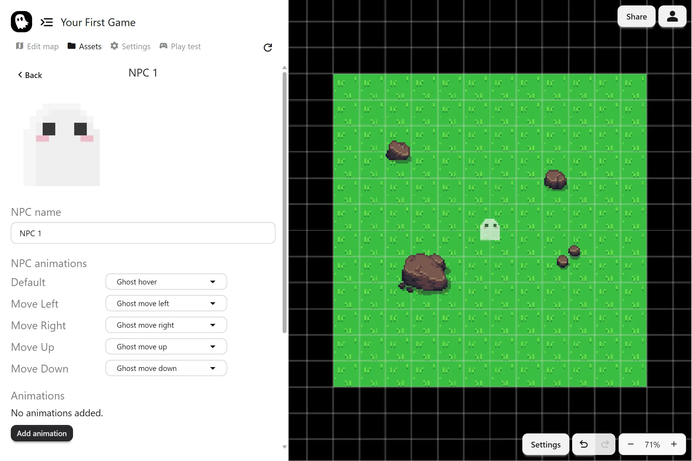 Section titled “Adding an NPC”Next we’ll add a character who can speak with the player.