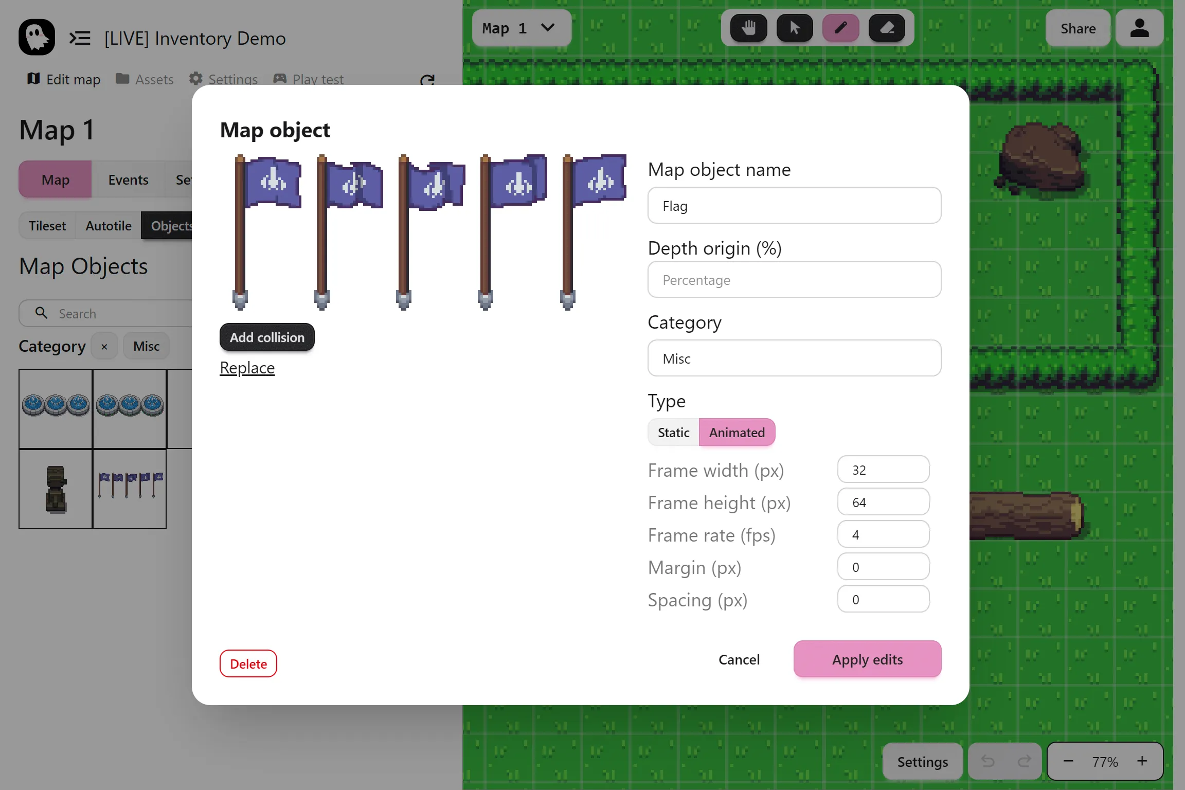 Section titled “Animated Objects”Objects can also be animated. Use a sprite strip (a series of frames in one image) and tell the editor the frame width, height, and frame rate. Your object will play that animation on loop in the map.