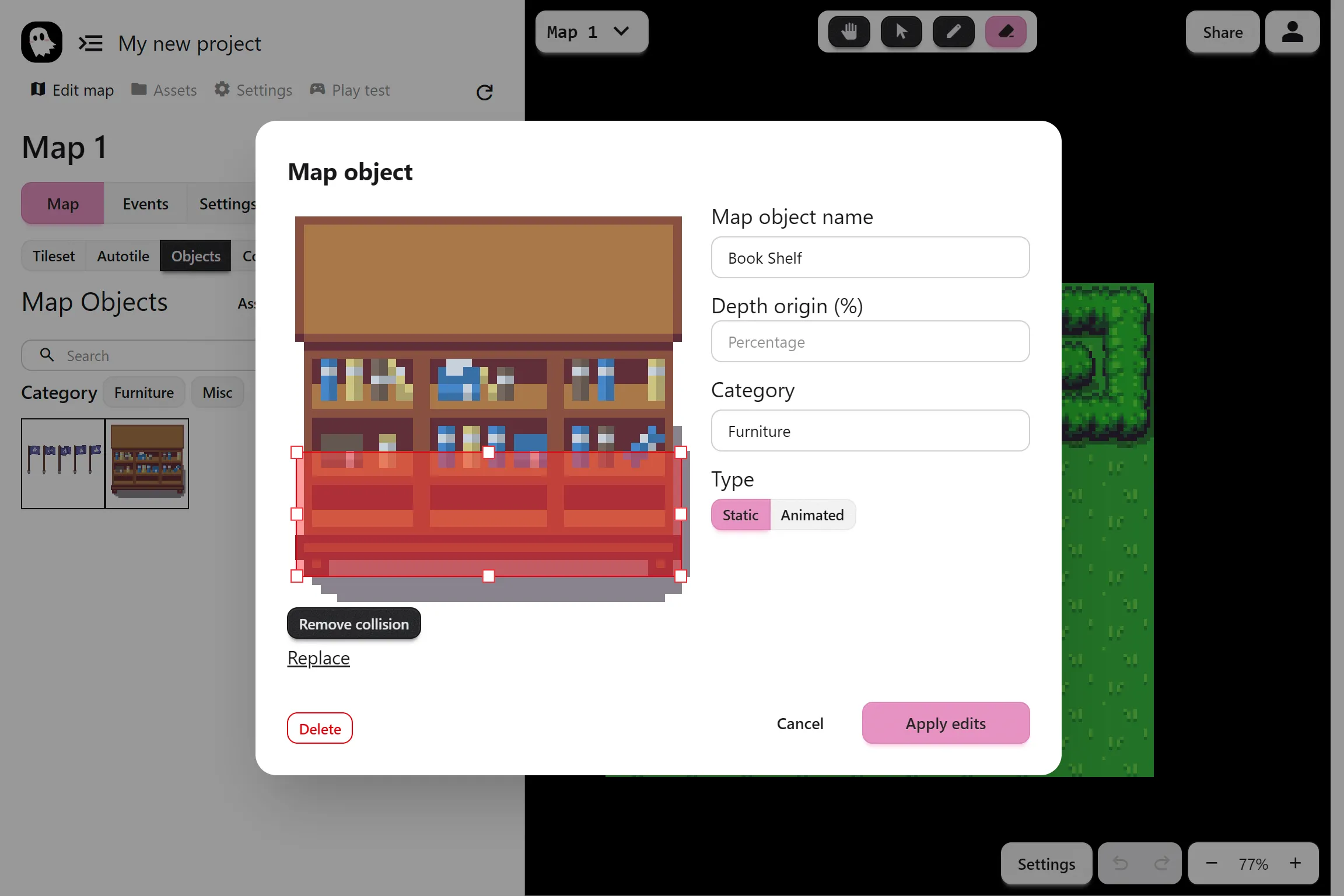 Section titled “Object Collisions”By default, objects do not block the player. You can add collisions by clicking Set Collision and resizing the red rectangle to match the solid area.